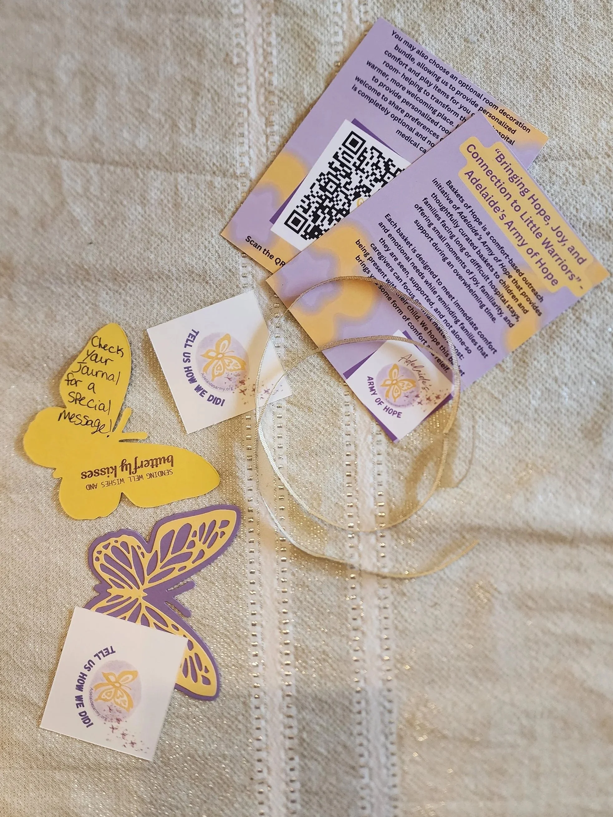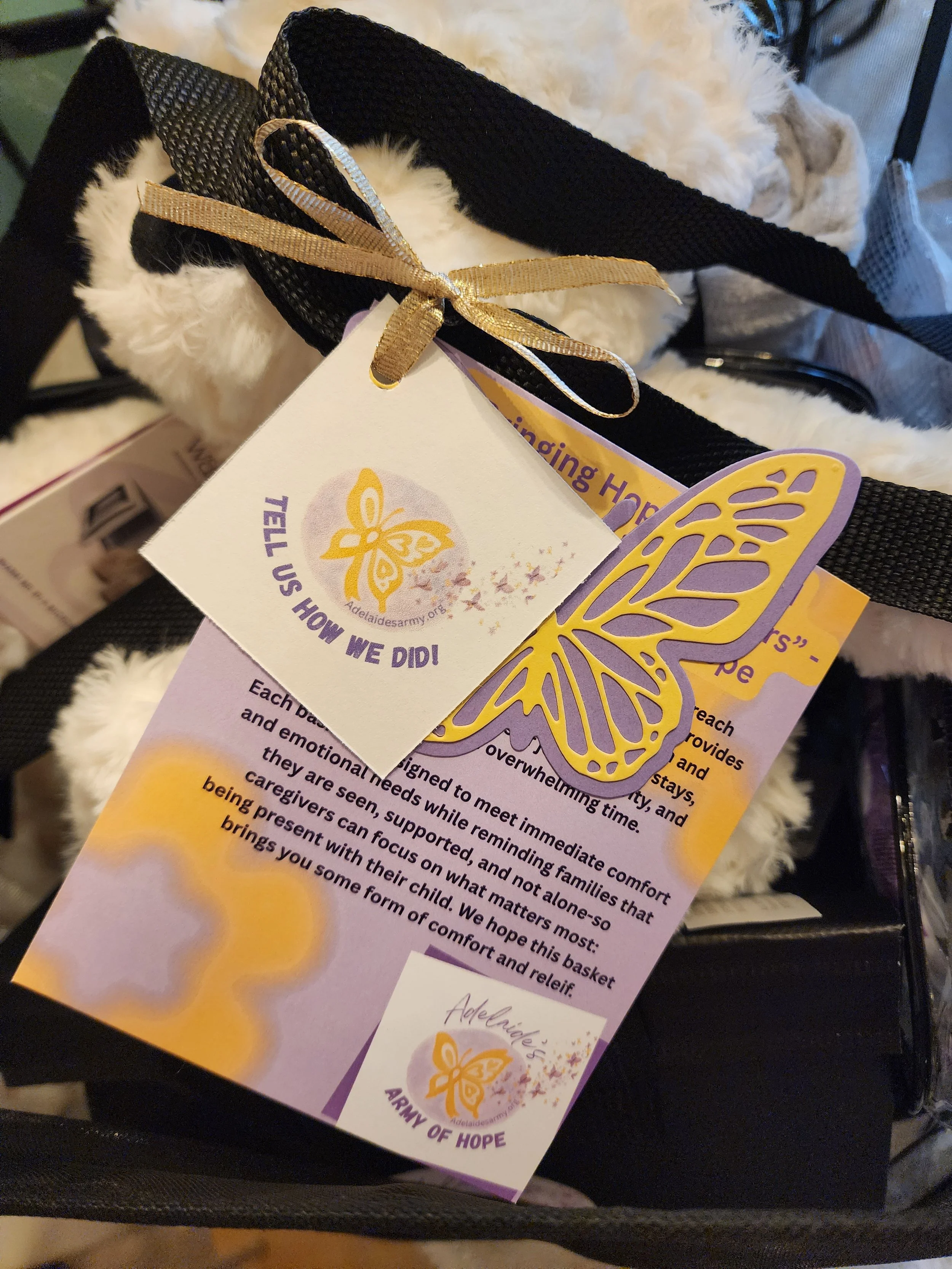 Through this program, supporters from our community provide messages of hope, prayers, uplifting words, and reminders of strength that are lovingly handwritten and placed inside our Baskets of Hope. Each message becomes a “butterfly kiss," a gentle reminder that even in the hardest moments, families are seen, supported, and never alone.